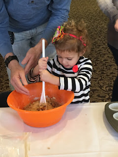 There are also two tables set up - one with a craft project built around the recipe of the day. There is also a Play Doh table, set up with thematic cookie cutters, rolling pins, and lots of fresh Play Doh. Yummy and inviting. Memories come flooding back to Play Doh tables of the past. When my girls were small, we used go to Mother Toddler classes each week. I was stay at home mom during a seven year hiatus from teaching until my daughters were ready for school themselves. I remember the Mom-Tot classes as a great social outlet and loved the interpersonal aspect of the Play Doh table in particular. Actual multi-syllabic, whole sentence adult conversation for about 20 minutes a week. I made some great forever friends at the Play Doh table also!